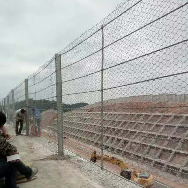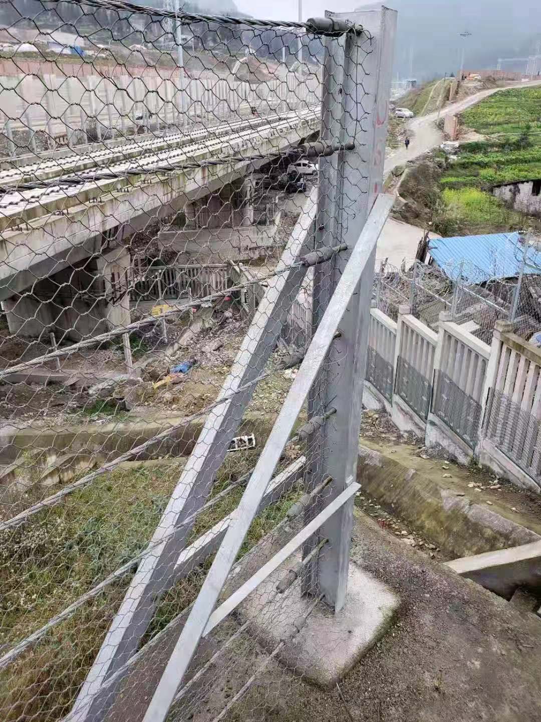 剛性防護網主要有型立柱(包括端頭立柱和中間立柱)、立柱基礎、攔截鋼絲繩、雙絞六邊形網、端頭鎖具、間隔壓板等部分組成。