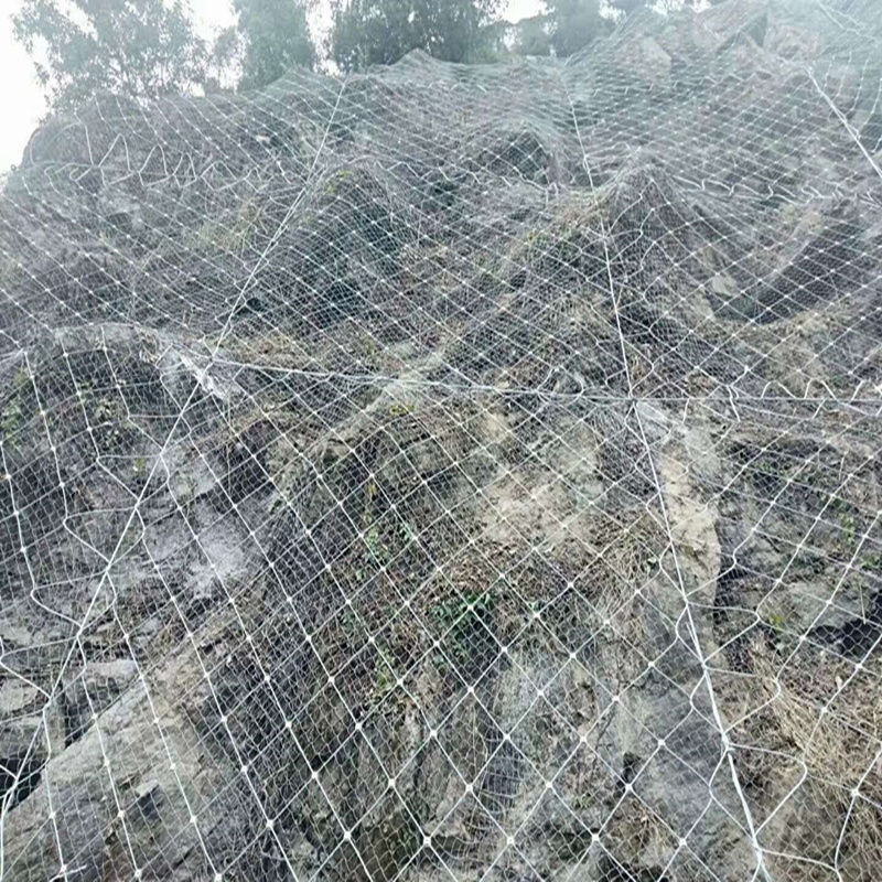 主動防護網(wǎng)系統(tǒng)以柔和性鋼繩網(wǎng)系統(tǒng)覆蓋有潛在危石落石的坡面,其縱橫交錯的φ16支撐繩與4.5m×4.5m(實際施工中可根據(jù)地形條件在4.2m-4.8m間作適當調(diào)整選用)正方形模式布置的錨桿相聯(lián)結,支撐繩構成的每個4.5m×4.5m網(wǎng)格內(nèi)鋪設一張4m×4m的鋼繩網(wǎng),其方格網(wǎng)孔為30cm×30cm,每張鋼繩網(wǎng)與四周支撐繩間用縫合繩縫合聯(lián)結并進行預張拉,緊貼坡面。